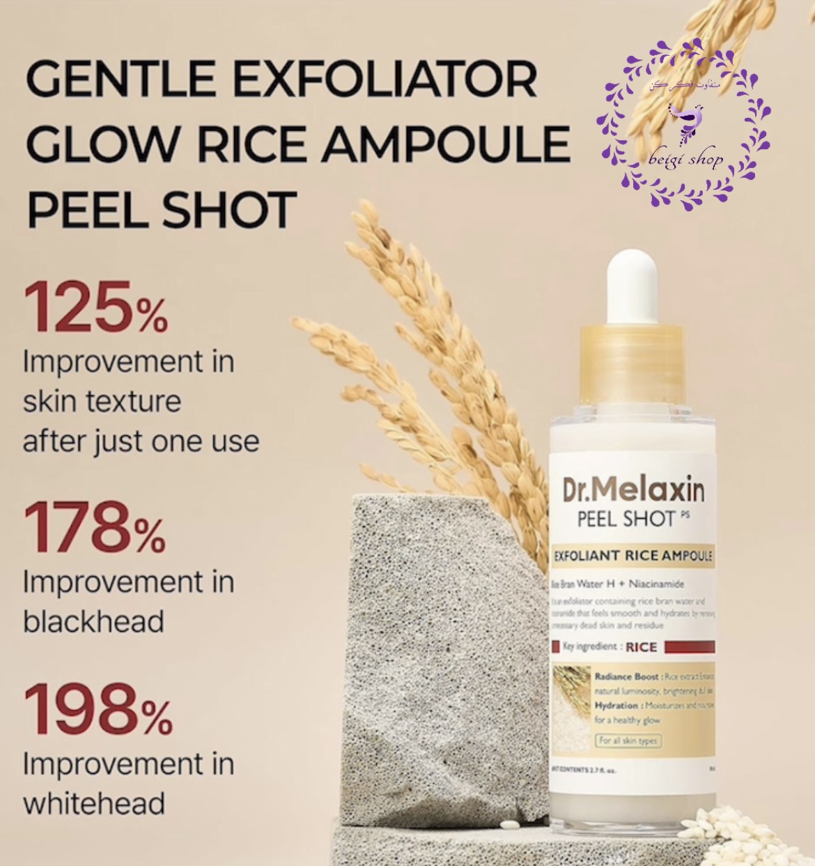 این محصول با بهرهگیری از آب سبوس برنج غنی شده و نیاسینامید، نهتنها پوست را به ملایمت لایهبرداری میکند، بلکه با تغذیه عمیق، مانع از خشکی پوست میشود. تکنولوژی “Peel Shot” در این آمپول به گونهای طراحی شده که با ماساژ دادن، آلودگیها و سلولهای مرده به صورت گلولههای ریز (Gommage) از سطح پوست جدا شده و بلافاصله تفاوت را در نرمی و شفافیت پوست حس خواهید کرد.